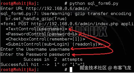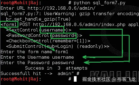 在上述代码中,我们使用了一个额外的变量form;在输出中,您必须选择表单名称。在sql_form6.py代码中,我假设用户名和密码包含在表单编号1中。