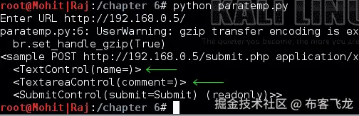 这段代码是为一个使用名称和评论字段的网站编写的。这小段代码将给你一个关于如何进行 XSS 攻击的想法。有时,当你提交评论时,网站会重定向到显示页面。这就是为什么我们使用br.set_handle_redirect(False)语句来进行评论。在代码中,我们将利用代码存储在mohit.xss shelve 文件中。br.forms()中的表单语句将打印出表单。通过查看表单,你可以选择要攻击的表单字段。设置flag = 'y'变量使while循环至少执行一次。有趣的是,当我们使用br.open(url)语句时,它每次都会打开网站的 URL,因为在我的虚拟网站中,我使用了重定向;这意味着在提交表单后,它会重定向到显示页面,显示旧的评论。br.form[non] = 'aaaaaaa'语句只是在输入字段中填充aaaaaa字符串。br.form[att] = s['xss'][p]语句显示所选字段将被 XSS 攻击字符串填充。ch = raw_input("Do you continue press y ")语句要求用户输入下一个攻击。如果用户输入y或Y,ch.lower()将其变为y,保持while循环活动。