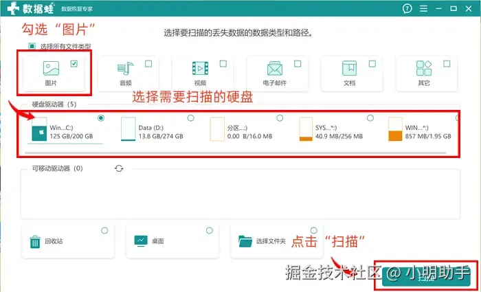 步骤1: 打开软件后就直接进入到扫描准备页面,上方勾选“图片”,再勾选误删照片的位置,选择完之后再点击“扫描”按钮,让软件开始扫描工作;
