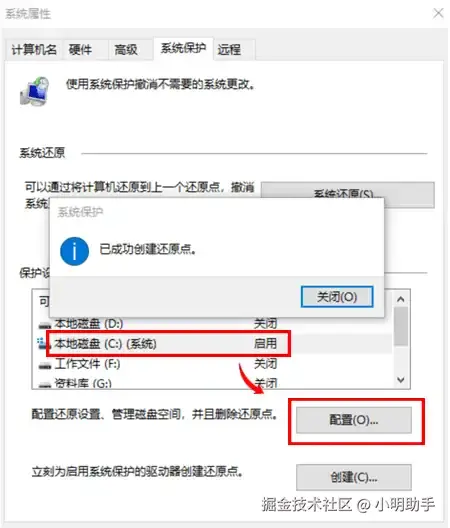 步骤2: 在“系统保护”页面按下“配置”按钮,设置需要回去的数据状态。