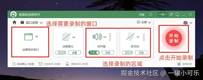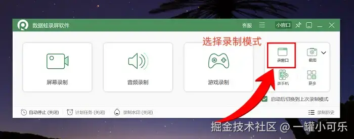 步骤1:首先,打开浏览器访问数据 蛙官方网站,在对应下载区域获取该视频录制软件的安装程序,按照提示完成软件在电脑上的安装流程。安装完成后启动软件,进入主界面。此时,软件会提供多种录制模式供选择。如果你想精准录制电脑中的某一个特定窗口,就点击选择 “窗口录制” 模式。