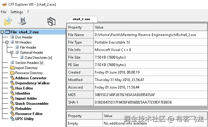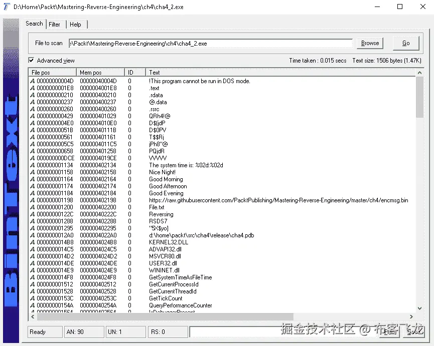 在没有执行的情况下,通过查看文件的二进制并解析每个字节,可以提供继续进一步分析所需的大部分信息。仅仅知道文件的类型,就可以帮助分析员准备特定的工具集和参考资料。搜索文本字符串也可以提供关于程序作者的信息、程序的来源以及程序的功能。