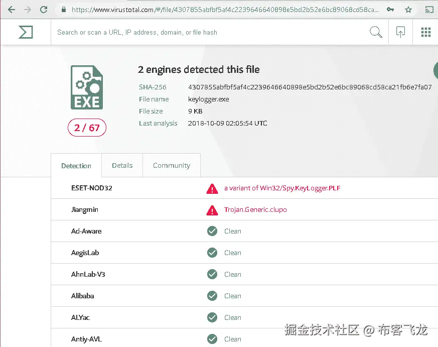 VirusTotal: 该工具提交文件或 URL,并与各种安全程序的检测结果进行交叉参考。结果能够帮助我们判断该文件是否确实为恶意文件。它还可以展示一些文件信息,如 SHA256、MD5、文件大小以及任何指示信息。