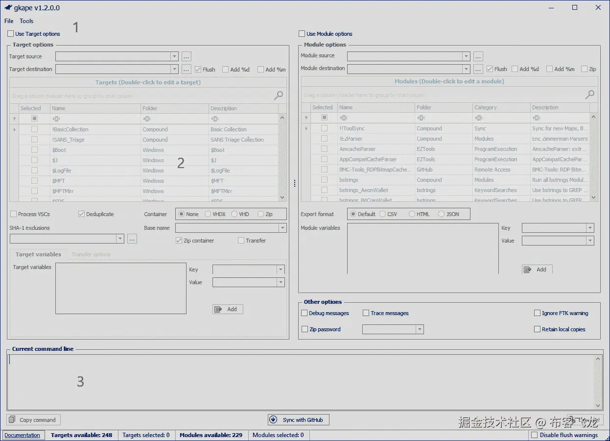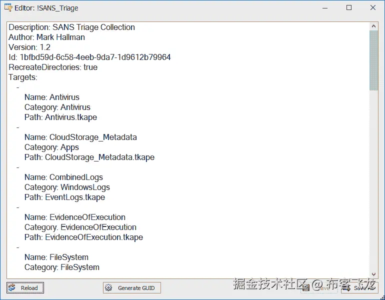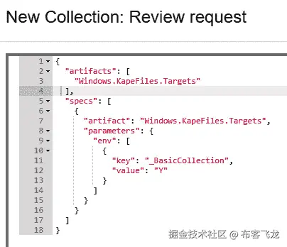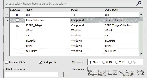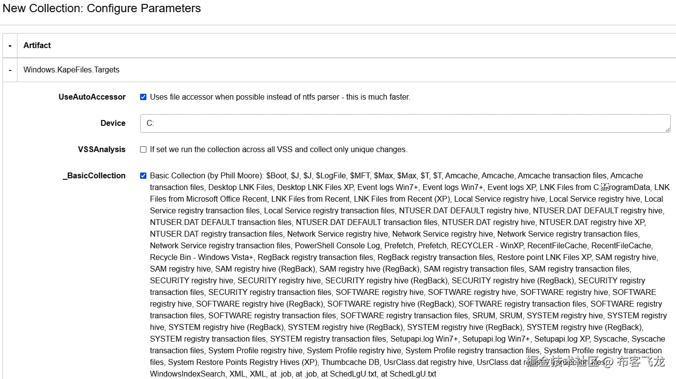 - 点击工件时,右侧窗格将弹出以下对话框。此信息详细说明了可以设置的参数。这与之前关于 KAPE 讨论的集合类型相匹配: