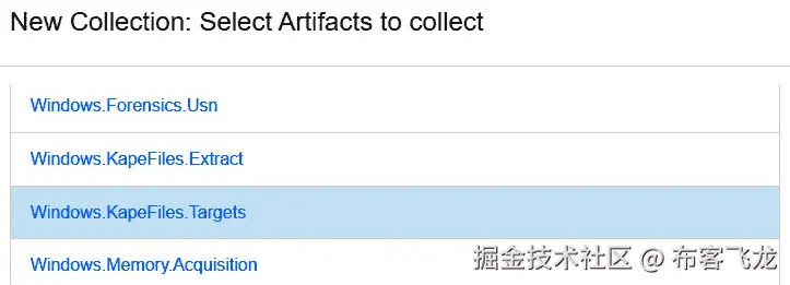 - 这将打开新建集合:选择要收集的工件窗口。可以收集的证据项和集合范围广泛。在本例中,分析师希望收集 KAPE 的目标工件。导航到Windows.KapeFiles.Targets,如下所示: