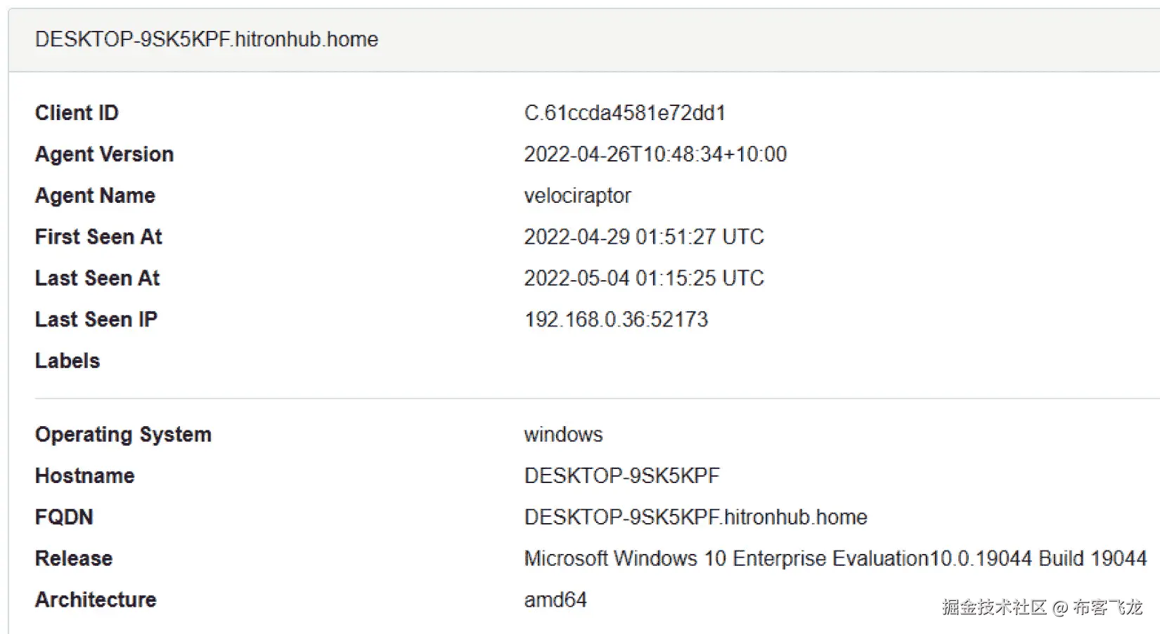 - 在这个例子中,分析员想要查看主机名DESKTOP-9SK5KPF。单击相应的客户端 ID 将显示以下信息: