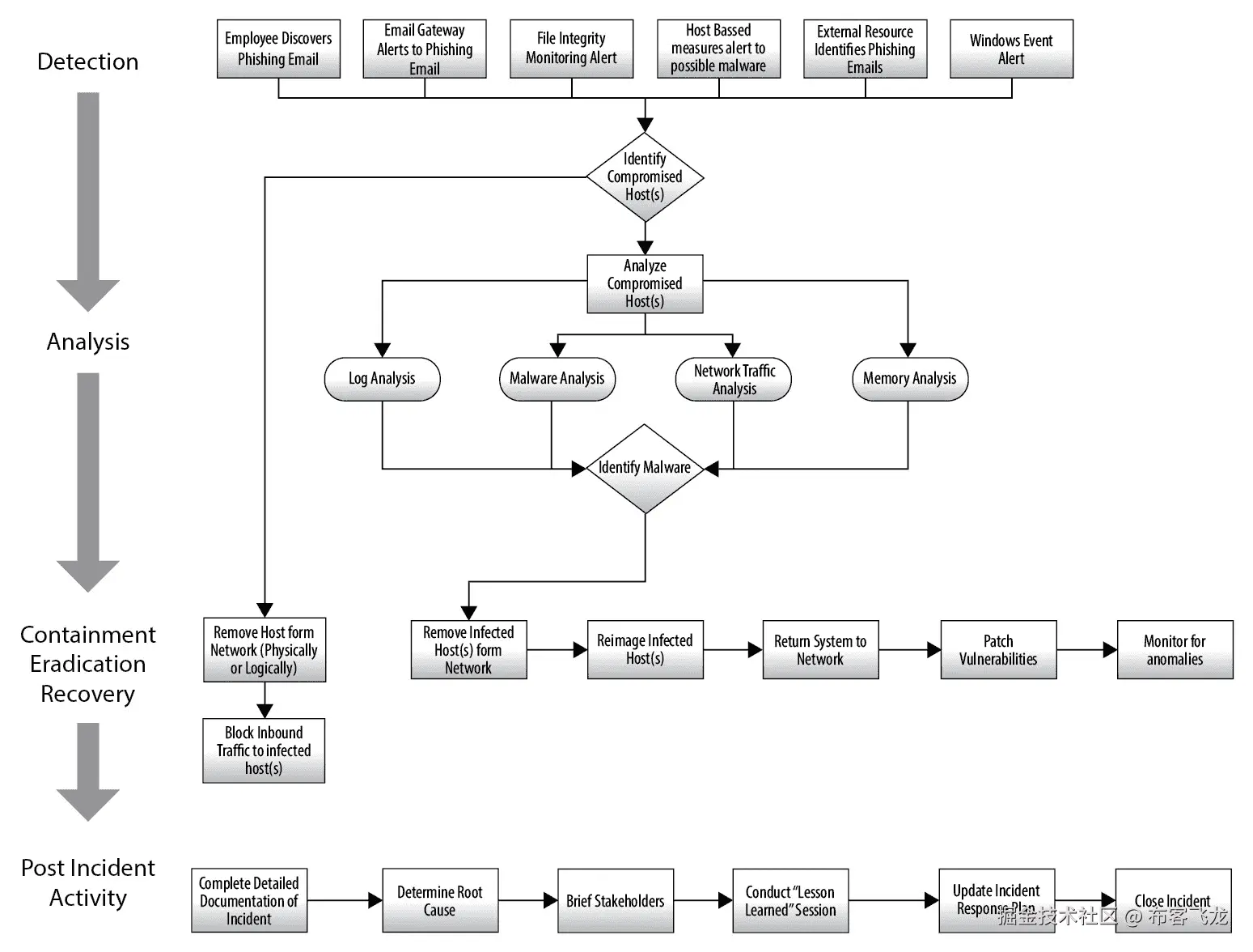 为了在组织内部建立这一能力,必须解决几个关键组成部分。首先,组织需要对 IR 过程有一定的了解。该过程概述了事件的一般流程以及在每个阶段采取的一般行动。其次,组织需要能够接触到那些构成任何 IR 能力核心的人员。一旦团队组建完成,就需要制定正式的计划和相关流程。这些书面计划和流程构成了组织在事件发生时可以遵循的有序结构。最后,在建立了这一框架后,必须持续评估、测试并改进该计划,因为新的威胁不断出现。利用这个框架将使组织能够为许多组织已经面临的不幸现实做好准备——一个影响安全的事件。