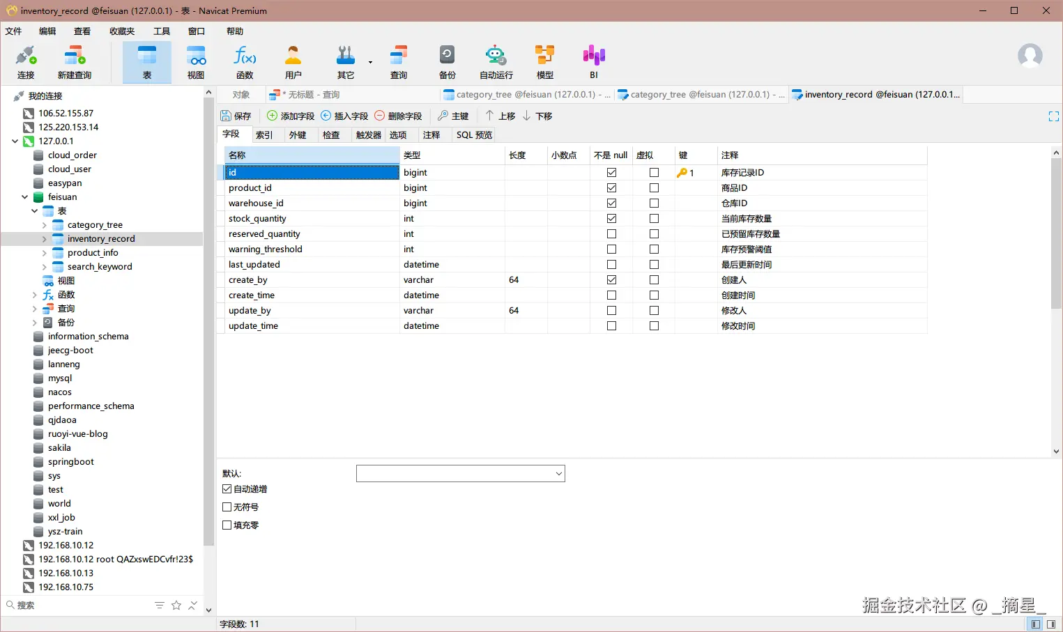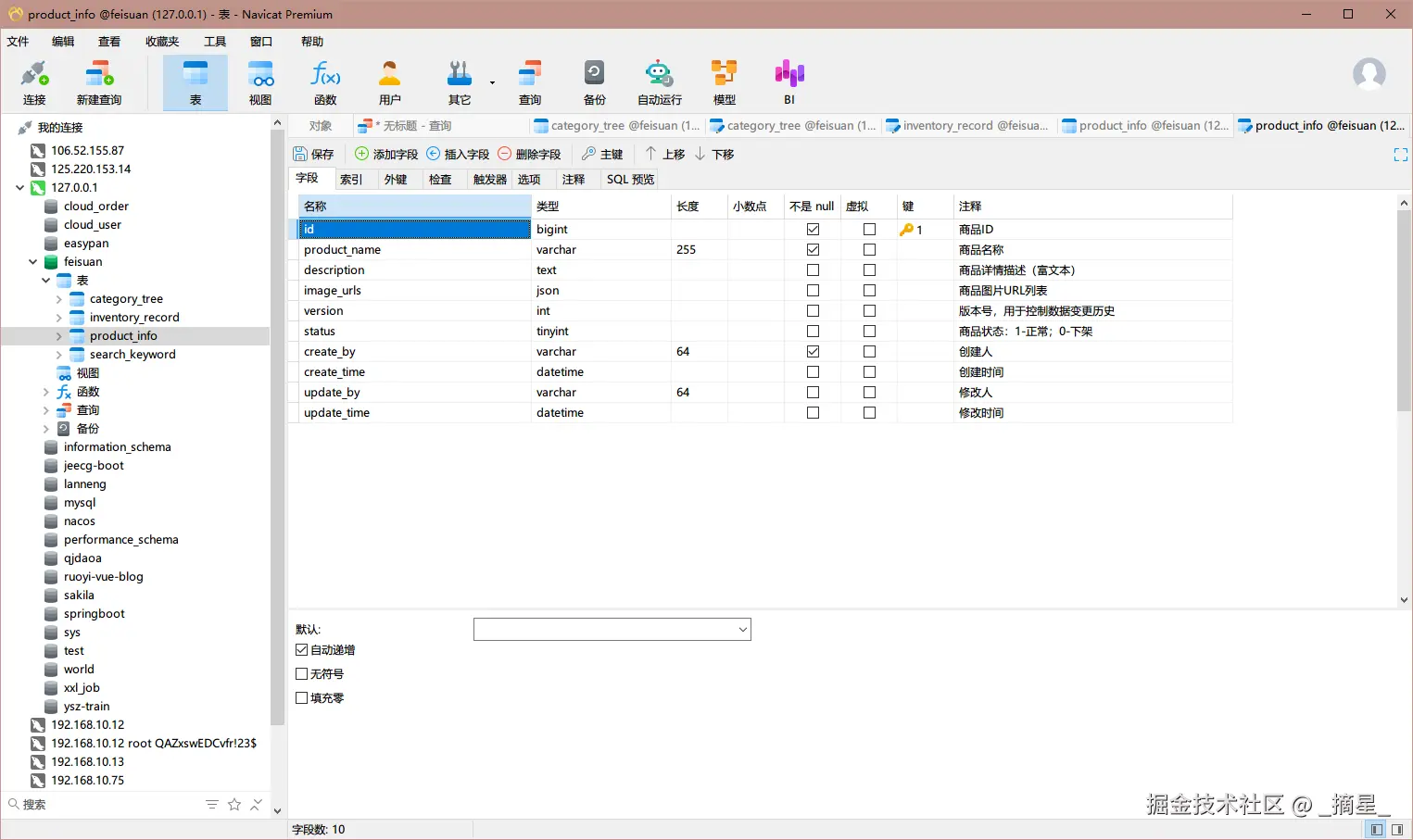 | 功能模块 | 主要功能描述 | | --- | --- | | **商品信息管理** | • 实现商品的创建、查询、修改、删除(CRUD)操作 • 支持富文本内容编辑和图片上传功能 • 集成版本控制机制,确保商品数据变更可追溯 • 具备完整的数据校验与异常处理能力 | | **智能分类管理** | • 构建多级分类树结构 • 提供拖拽式分类编辑功能 • 支持分类层级的灵活调整 • 结合属性模板配置机制 • 允许为不同分类设置不同的属性规格 • 提升商品管理的标准化程度 | | **动态库存控制** | • 实现商品实时库存同步更新 • 自动触发库存预警机制 • 在库存低于设定阈值时及时通知相关人员 • 支持跨仓库间的库存调度逻辑 • 保障供应链高效运作 | | **搜索推荐引擎** | • 基于Elasticsearch实现商品信息的全文检索功能 • 支持关键词匹配、模糊查询等高级搜索特性 • 集成个性化推荐算法 • 根据用户行为与偏好进行商品推荐 • 优化用户体验 |表结构设计阶段