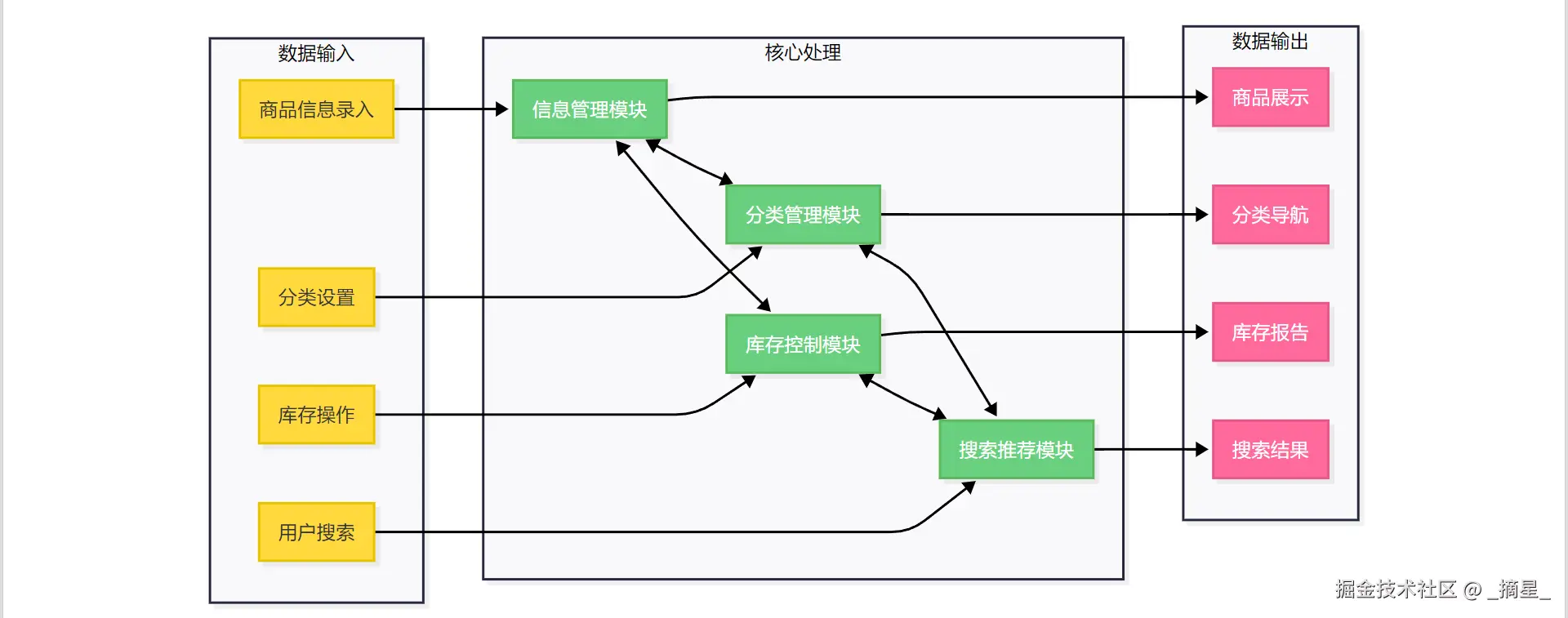 核心功能模块包括:1)商品信息管理-实现商品CRUD操作、富文本编辑、图片上传、版本控制;2)智能分类管理-构建多级分类树、拖拽编辑器、属性模板配置;3)动态库存控制-实时库存同步、智能预警、多仓库调度;4)搜索推荐引擎-全文检索、个性化推荐算法集成。