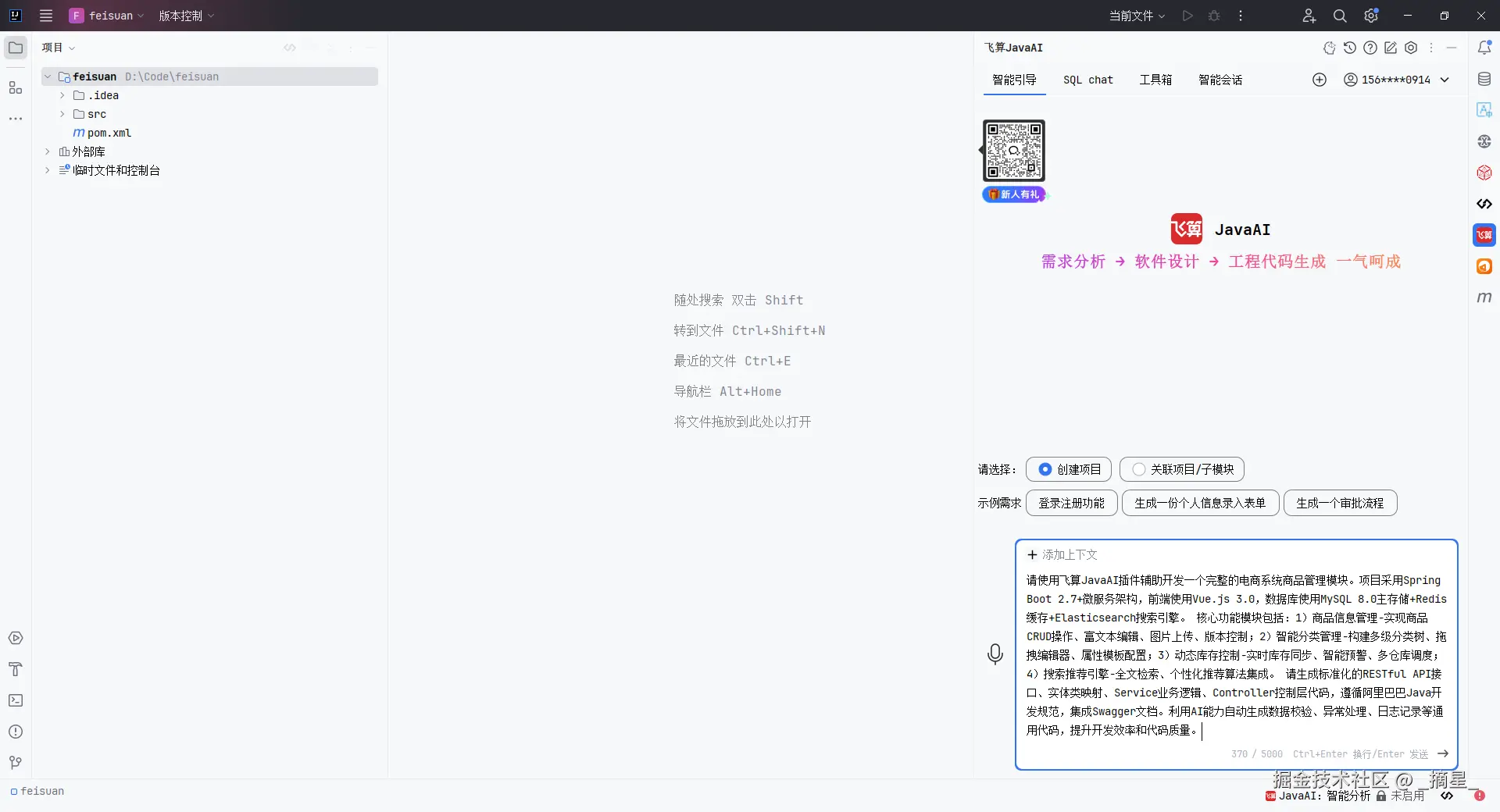 需求分析完毕之后,准备好飞算JavaAI的AI Coding开发提示词,本次要做的项目开发提示词:请使用飞算JavaAI插件辅助开发一个完整的电商系统商品管理模块。项目采用Spring Boot 2.7+微服务架构,前端使用Vue.js 3.0,数据库使用MySQL 8.0主存储+Redis缓存+Elasticsearch搜索引擎。