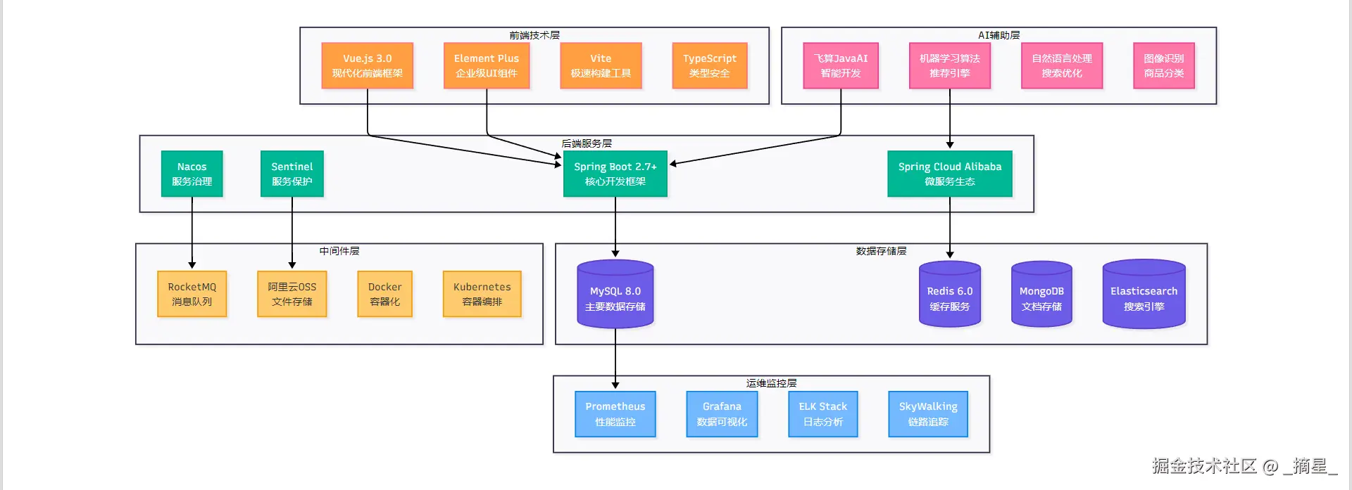 **框架选择:** 采用Spring Boot 2.7+作为后端开发的核心框架,结合Spring Cloud Alibaba构建稳定可靠的微服务生态体系。这套"黄金组合"不仅提供了丰富的开发组件和中间件集成能力,更具备出色的可扩展性和维护性,能够轻松应对电商系统的复杂业务场景和高并发访问需求。数据存储方案: 构建"一主多辅"的混合存储架构,MySQL 8.0作为核心业务数据的主存储,Redis 6.0提供高速缓存服务,MongoDB负责处理商品详情等非结构化数据,阿里云OSS托管商品图片等静态资源。这种多元化的存储策略既满足了不同数据类型的特殊需求,又显著提升了系统的整体性能表现。