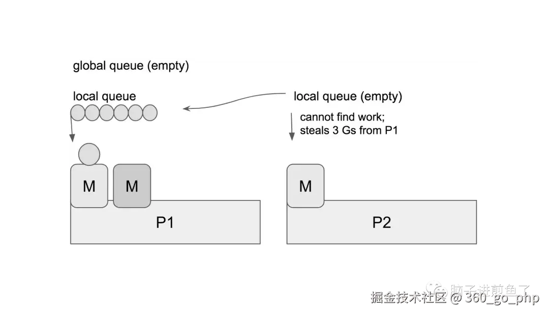 在这个例子中,P2 在本地队列中找不到可以运行的 G,它会执行 work-stealing 调度算法,随机选择其它的处理器 P1,并从 P1 的本地队列中窃取了三个 G 到它自己的本地队列中去。