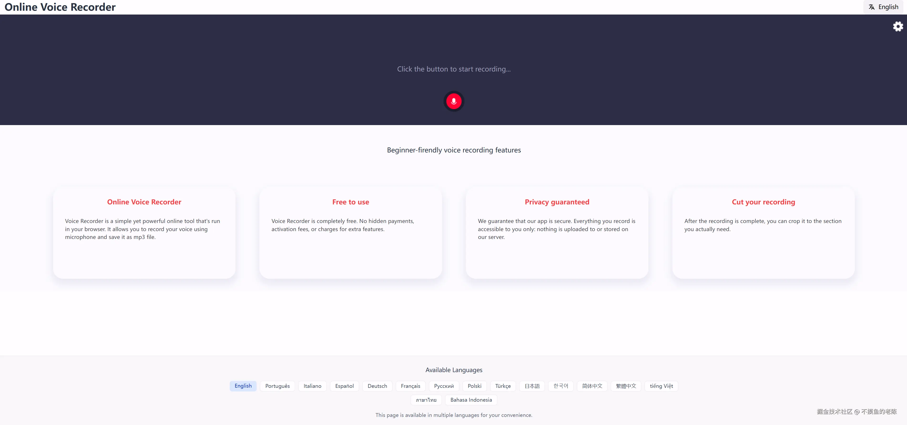 Online Recorder App是一款轻量高效的在线录音工具,无需安装和登录,所有操作在本地浏览器完成,提供简单的音频剪辑功能并支持导出MP3文件。