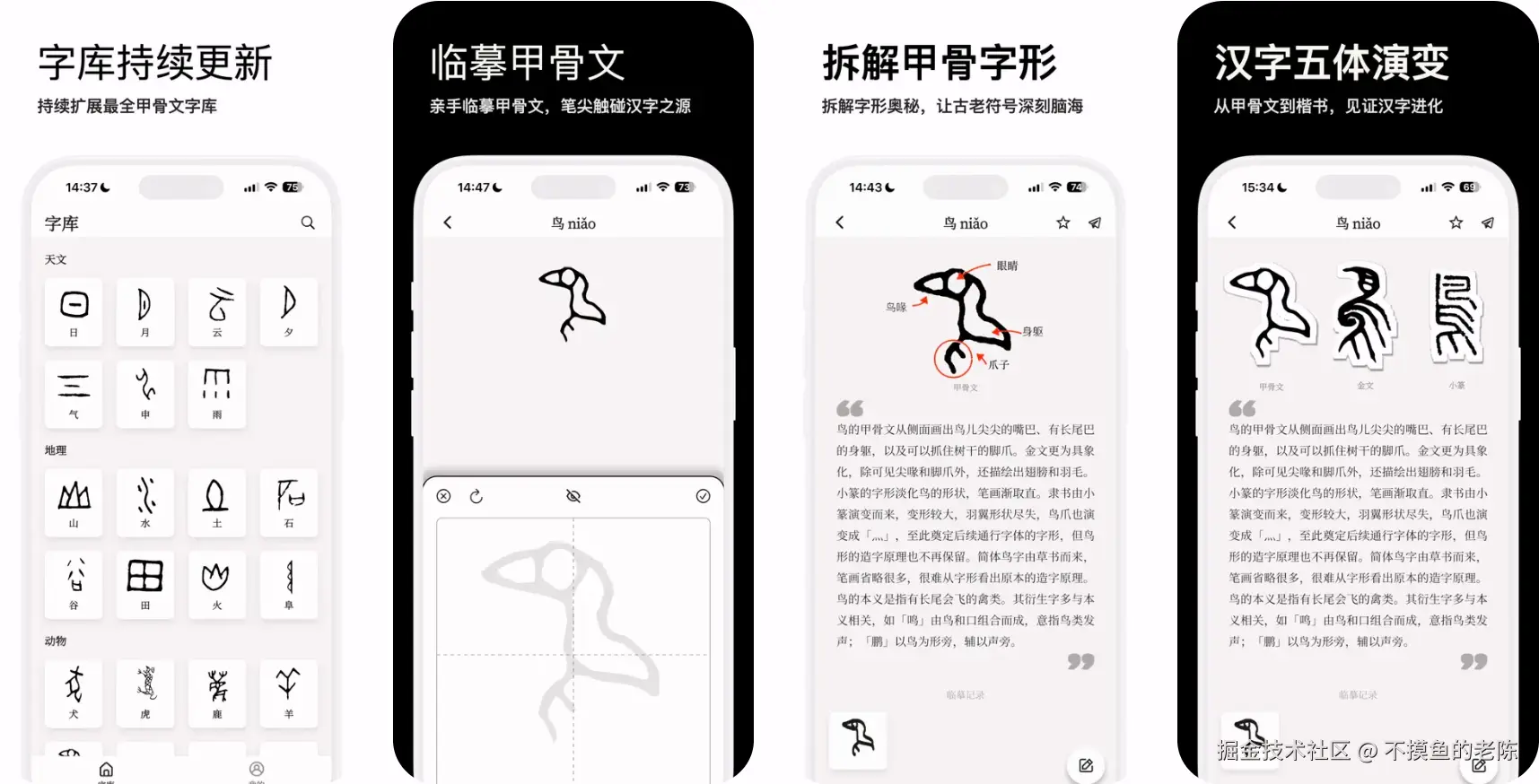 甲骨文汉字是一款汉字学习应用,提供甲骨文拆解学习和汉字五体演变的功能,支持iOS和Android平台。