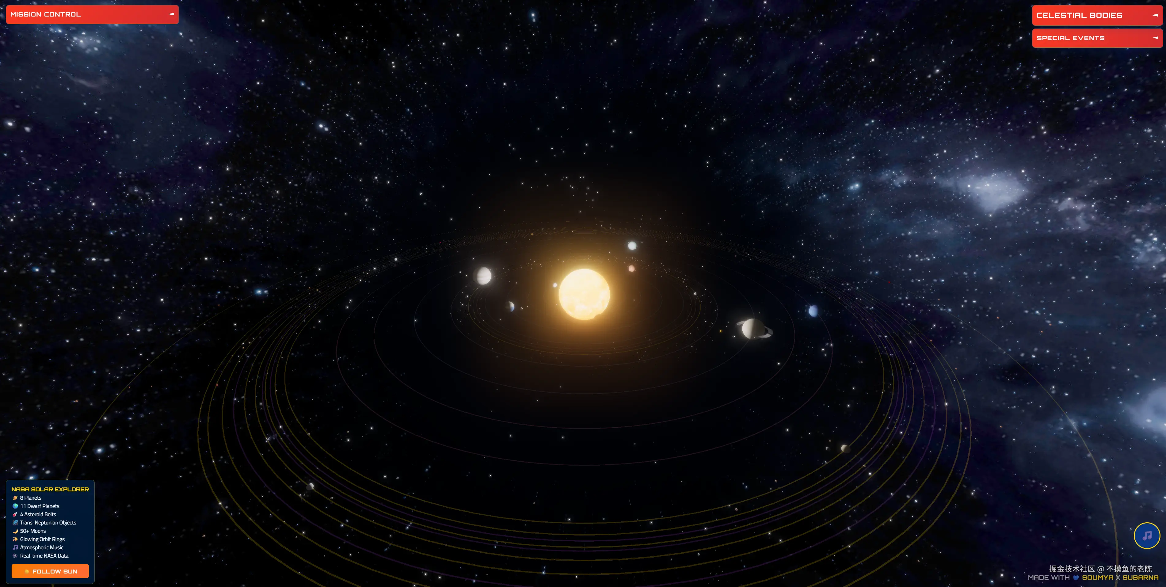 3D Solar System是一款交互式3D太阳系应用,用户可以飞行浏览行星、切换轨道、开关标签,并支持桌面和移动设备。