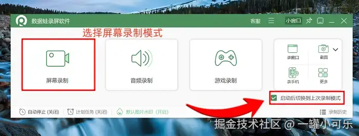 备注:如果你后续会频繁使用相同的录制模式,可以在主界面右下角勾选 “启动后自动使用上次录制模式” 选项。勾选后,下次启动软件时将直接进入上次使用的录制模式,省去重复选择参数的步骤,提升操作效率。