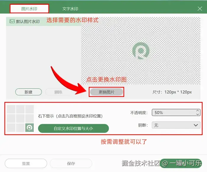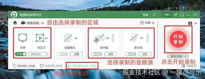 步骤2:根据录制需求确定画面范围,音频方面,可以根据需求手动开启。如果你想在录制视频中添加专属标识(如个人LOGO、文字水印),就点击界面中的 “图片水印” 选项,在弹出的设置窗口中上传图片素材或输入文字,调整水印位置、大小及透明度,完成后保存设置。所有参数配置完成后,点击界面中的 “开始录制” 按钮,软件就会进入录制状态。