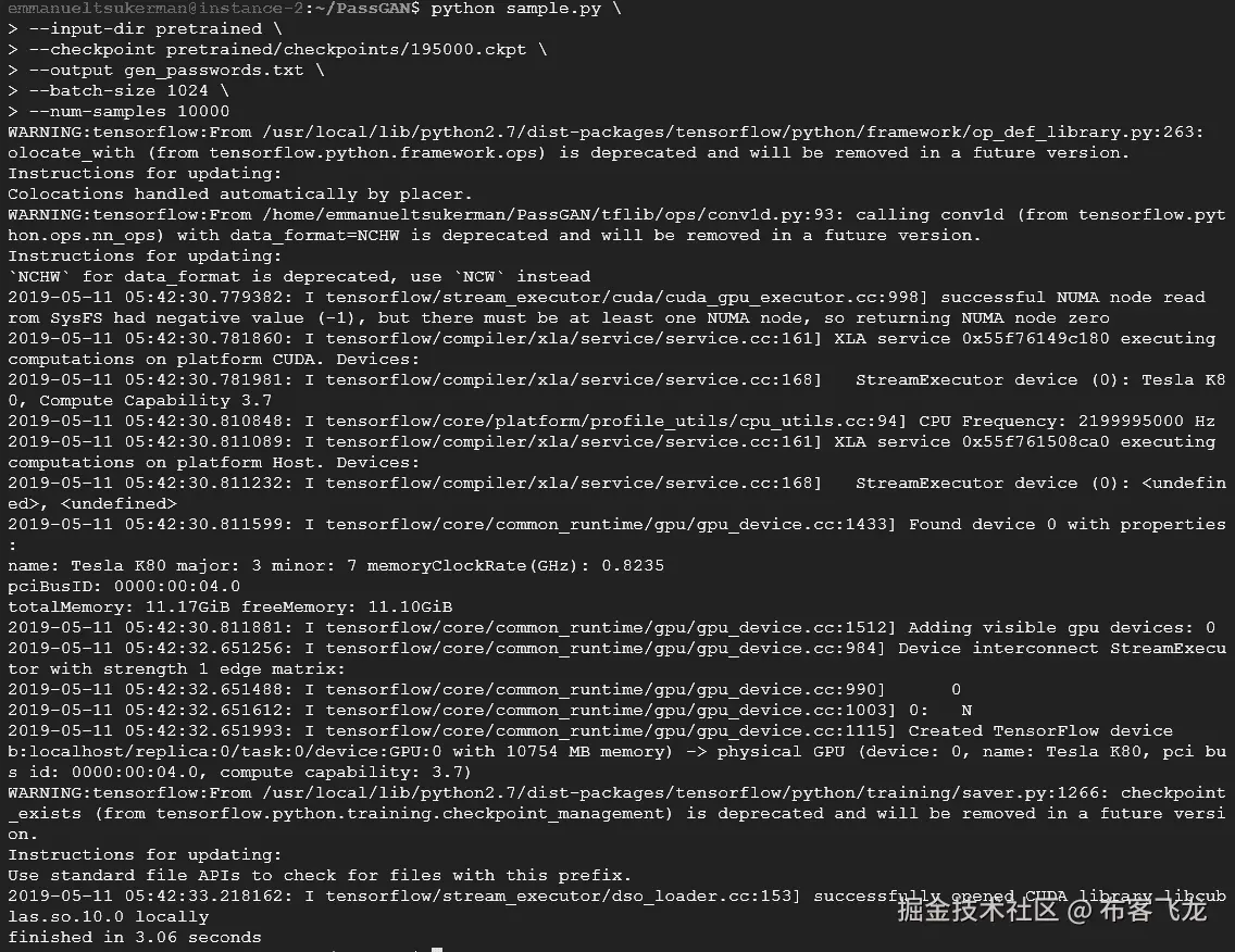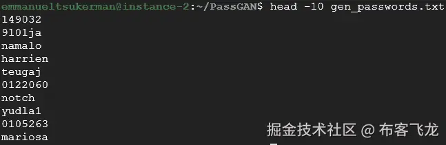 在本教程中,我们在步骤 1中直接训练了我们的神经网络。根据需要,还可以使用几个附加的标志来定制训练。现在我们已经训练好了模型,接下来需要输出一个包含 100,000 个密码的列表,所有这些密码都是由模型生成的(步骤 2)。这些密码是可能的智能猜测。通过检查步骤 2的输出,我们可以看到密码的展示方式如下: