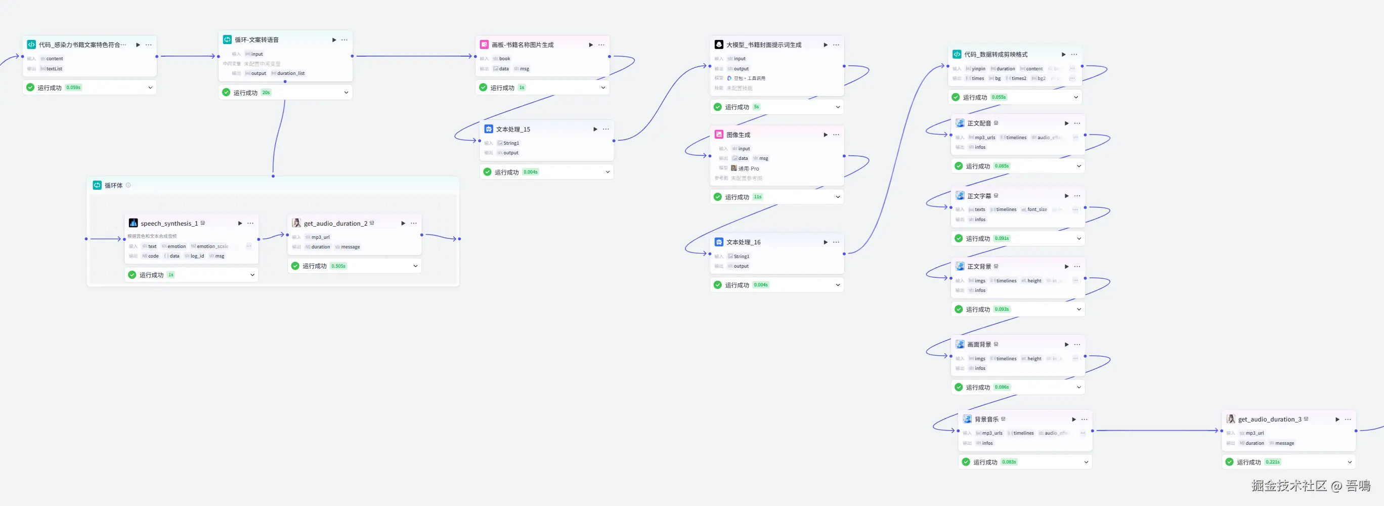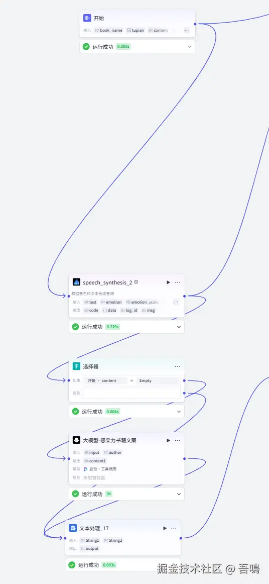 这一部分的工作流主要是用来格式化处理灵魂文案,去除掉一些标点特殊符号,然后进行文案配音,把文案转成更有感染力的音频。除此之外,这部分的工作流节点还会生成卡点视频的背景图片,根据书籍名称自动匹配符合风格的背景图。