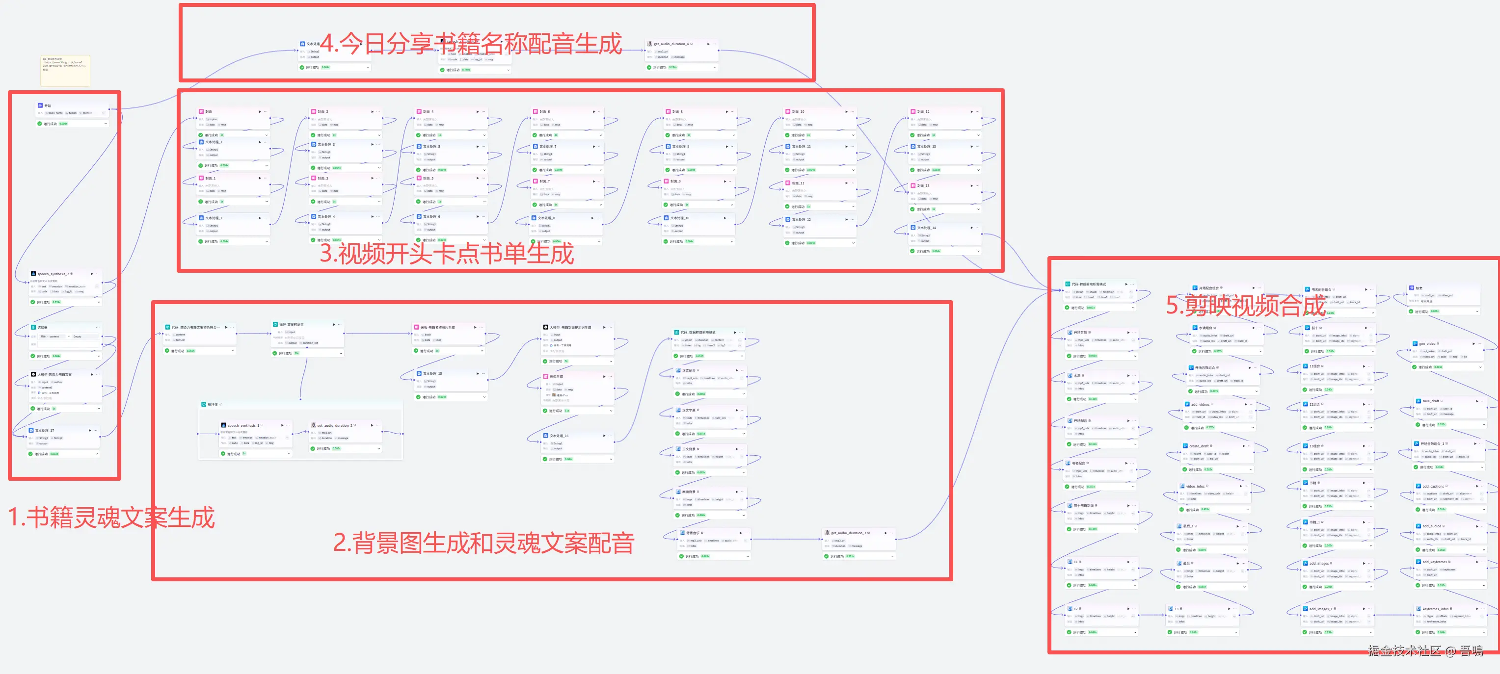 先看一下完整的工作流流程图,工作流的节点还是蛮多的,本文已经对工作流做了功能划分,分别分为下图中的五大部分。