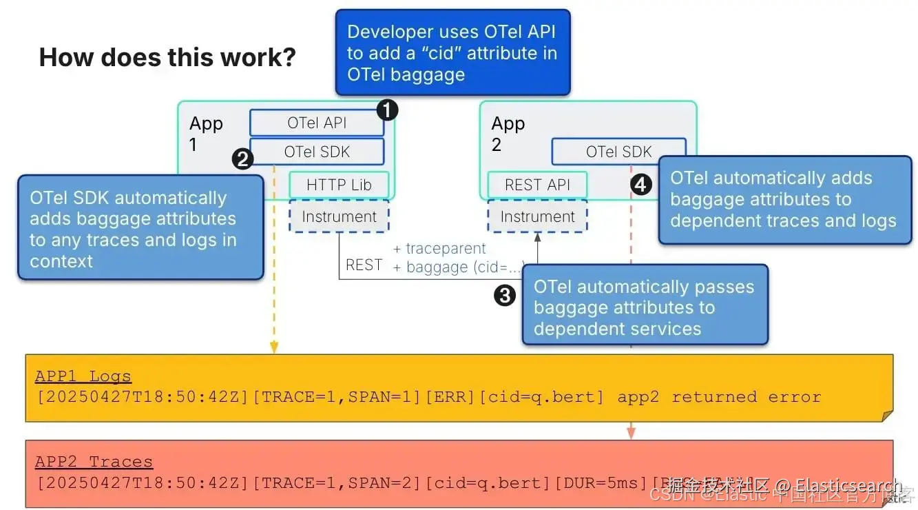 意味着客户 ID 会自动在每个下游服务调用、每次数据库查询、每条日志消息中流动。这样,你就可以在整个分布式系统中按客户 ID 搜索所有遥测数据。