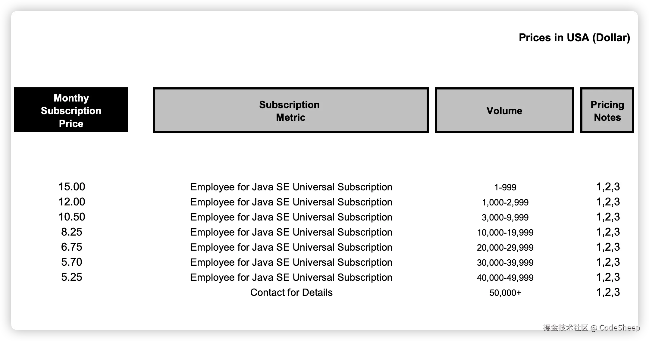 也就是说,这个收费标准是直接基于公司里总的员工数来进行计算的,而不仅仅是使用 Java SE 的员工数,这也是当时新订阅模式发布以后最引人关注,也是最具争议的一点。