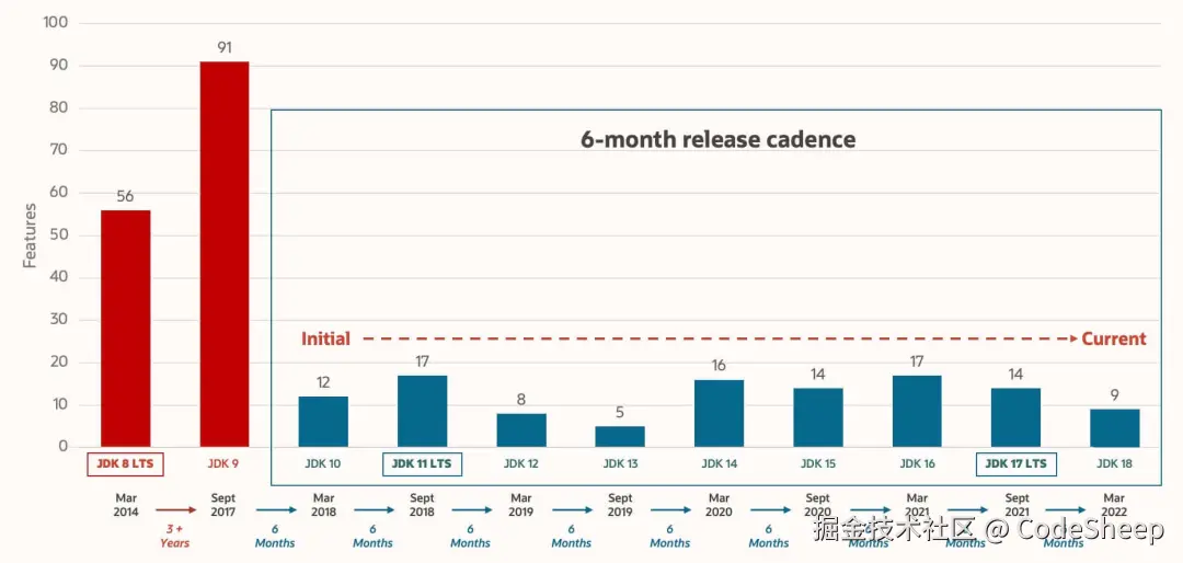 其实 Oracle 早在 2017 年 9 月就宣布将改变 JDK 版本发布周期。新版本发布周期中,一改原先以特性驱动的发布方式,而变成了以时间为驱动的版本迭代。