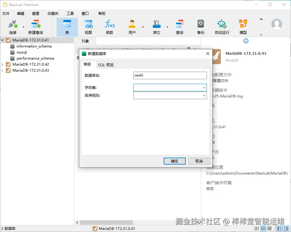 使用Navicat Premium连接主节点(Lab-04-Task-01),并创建数据库“ceshi”,如图4-5所示。