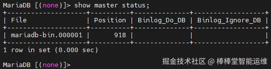 (5)在主节点(Lab-04-Task-01)上查看MariaDB数据库的主节点服务状态,记录主节点当前同步位置(需记录File和Position两个参数对应的值,如图4-2所示。