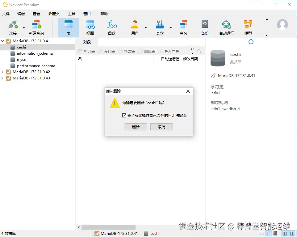 使用Navicat Premium连接主节点(Lab-04-Task-01),并删除数据库“ceshi”,如图4-6所示。
