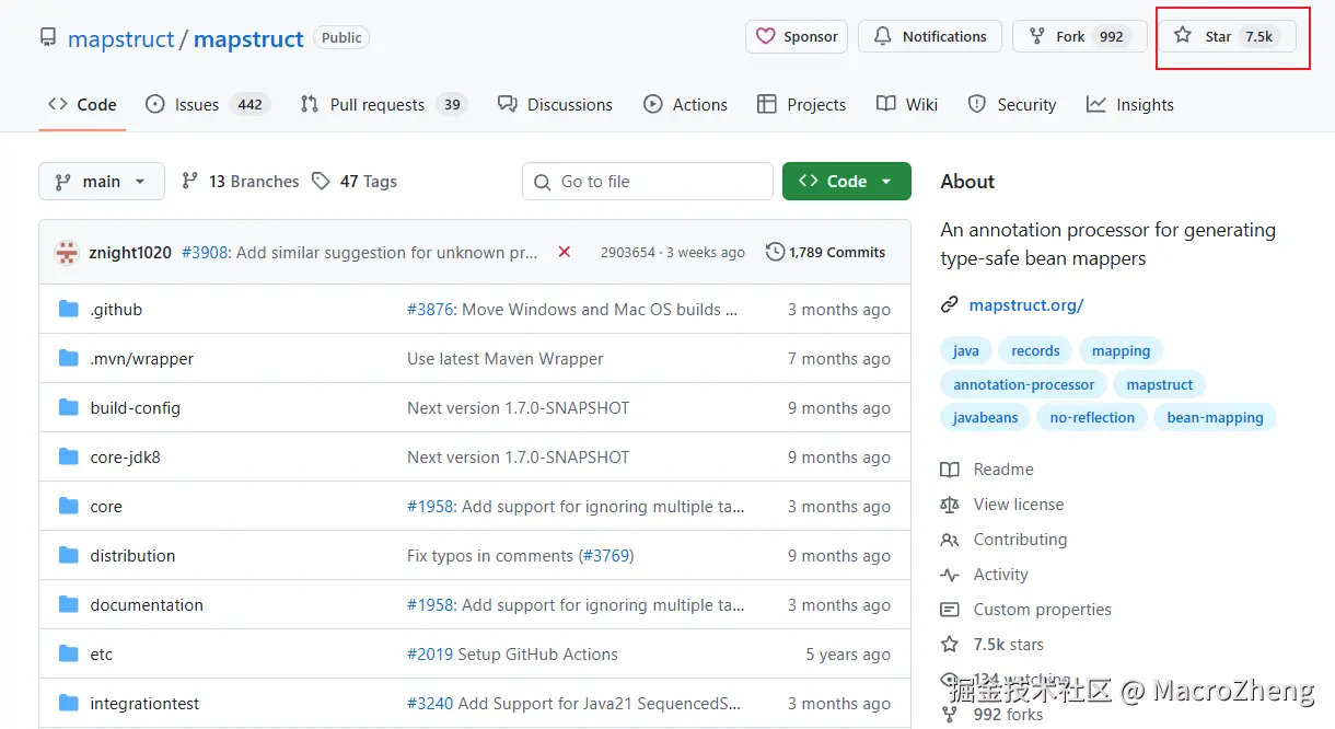 MapStruct是一款基于Java注解的对象属性映射工具,在Github上已经有7.5k+star。使用的时候我们只要在接口中定义好对象属性映射规则,它就能自动生成映射实现类,不使用反射,性能优秀,能实现各种复杂映射。