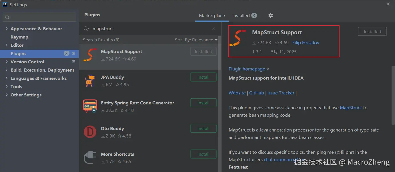 作为一款非常流行的对象映射工具,MapStruct还提供了专门的IDEA插件,我们在使用之前可以先安装好插件。