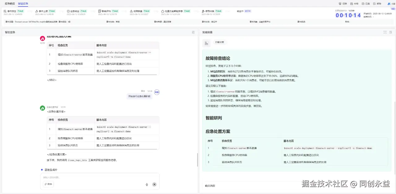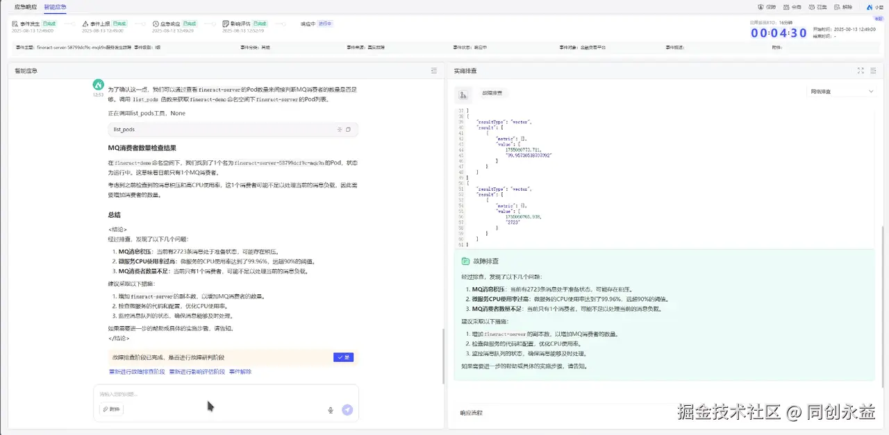 整个过程无需人工编写命令,平台全程自动化处置,验证了“故障注入→智能诊断→自动恢复”的闭环能力。