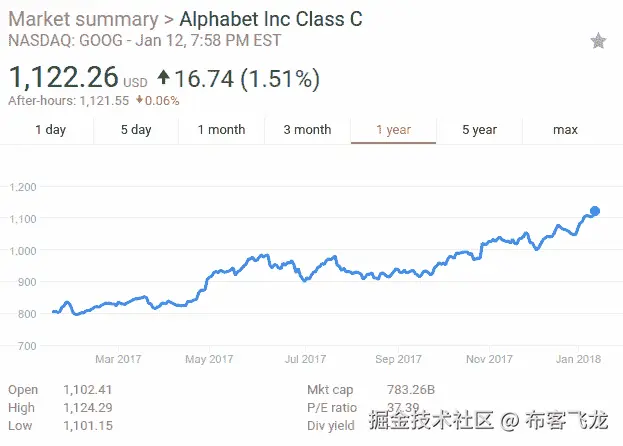 如果定义不清楚,我们来看一个例子:一个股票行情指示器,我们可以在其中观察股票价格随时间的变化,例如以下屏幕快照中的 Alphabet Inc.,这是时间序列的一个示例: