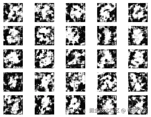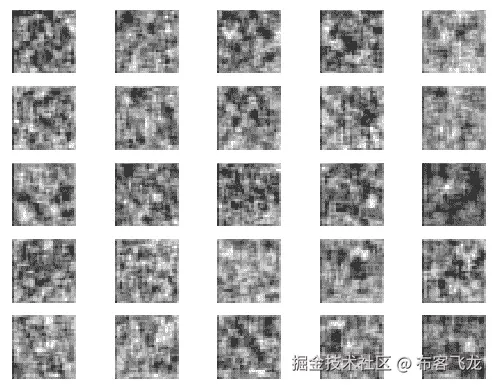 它通过创建噪声矩阵并检索图像矩阵来仅使用生成器。 然后,使用matplotlib.pyplot将这些图像保存到5 x 5网格中的磁盘上。