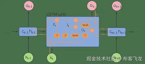 每个 LSTM 单元展开时,都有一个时间段t的输入,称为x[t],一个输出,称为o[t]以及从上一个时间步C[t-1]到下一个C[t]进行存储的存储器总线C。