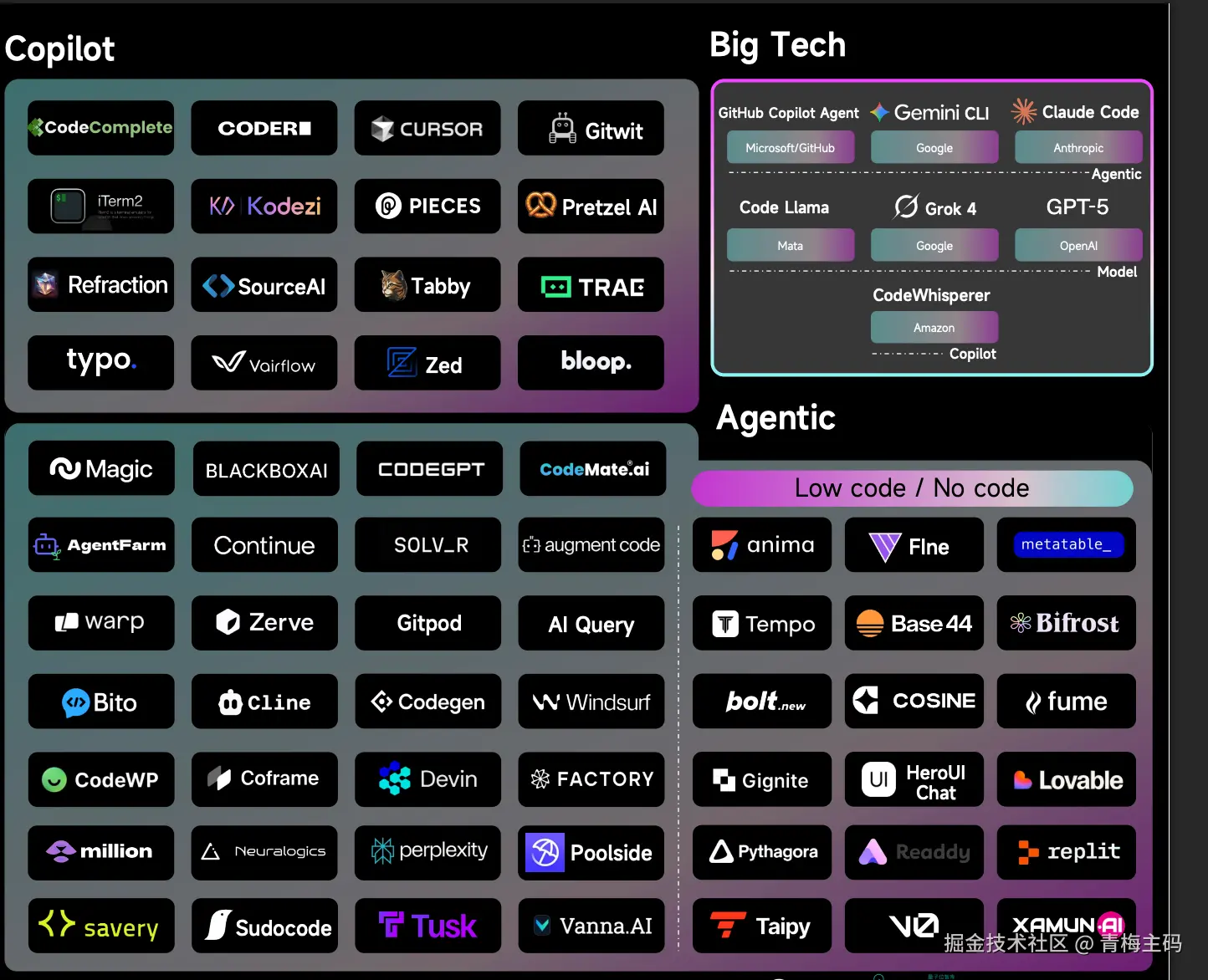 报告对当前市场玩家进行了全面梳理,按类别分为 助手类 、 代理类 、 Big Tech 和 Copilot 等。国际巨头如 Microsoft / GitHub 的 Copilot Agent 、 Google 的 Gemini CLI 、 Anthropic 的 Claude Code 、 OpenAI 的 Code Llama 和 Grok 4 、 Amazon 的 CodeWhisperer 占据主导地位。这些工具覆盖代码生成、补全和低代码/无代码开发。