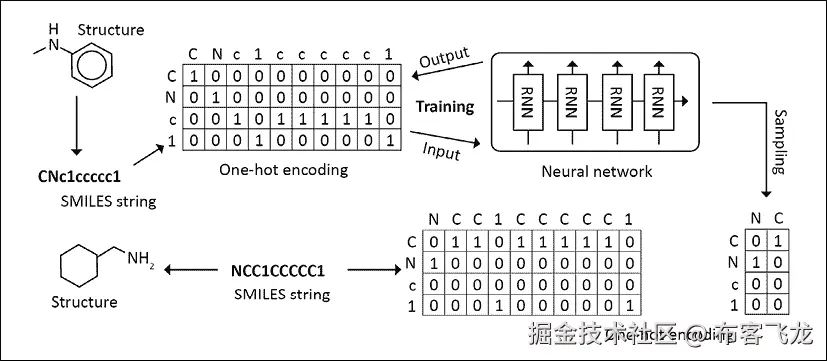 回到化学图的编码,也许不足为奇,我们可以使用基于循环神经网络(如 LSTM)的生成模型,从可能的分子图构型的巨大空间中采样。因为分子遵循特定的结构主题,这个问题比简单地独立采样原子集合更复杂,因为它们必须按照化学结构约束形成一个连贯的分子。图 13.3说明了这个过程可能是什么样子;将 2D 结构编码成二进制特征向量(有点类似我们在早期章节看到的文本表示),然后通过循环神经网络运行这些向量,训练一个根据先前的原子/键预测下一个原子或键的模型。一旦模型在输入数据上训练完成,它就可以被用来通过从这个生成器中一次次采样新结构来生成新的分子。变分自动编码器(第五章,使用 VAE 画图)也已经被用来生成分子⁴(图 13.4),同样生成对抗网络⁵(图 13.5),我们在第六章,使用 GAN 生成图像中介绍过。