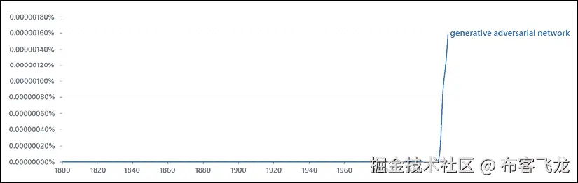 在前面的章节中,我们研究了使用生成型人工智能的大量应用,包括生成图片和文字,甚至音乐。然而,这是一个庞大且不断扩张的领域;在 Google 学术搜索中,与“生成对抗网络”匹配的论文数量为 27,200 篇,其中有 16,200 篇发表于 2020 年!对于一个从根本上始于 2014 年的领域来说,这是令人惊讶的指数增长,这也可以在 Google n-gram 查看器中得到体现(图 13.1):