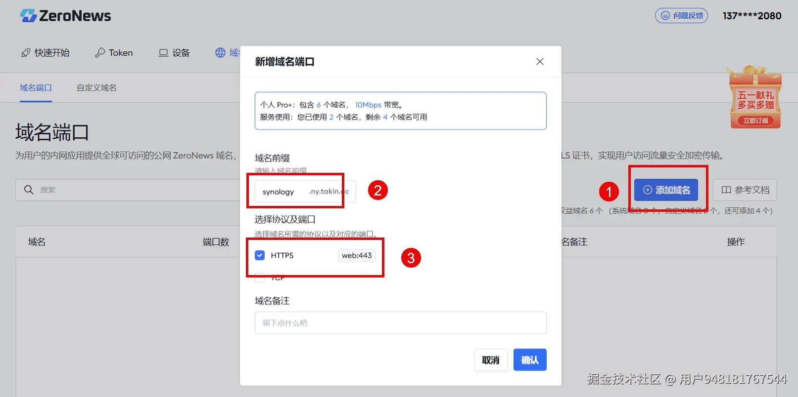 登录 ZeroNews 控制台,在 "域名端口" 管理页面, 点击 "添加域名" 添加公网可访问的域名。