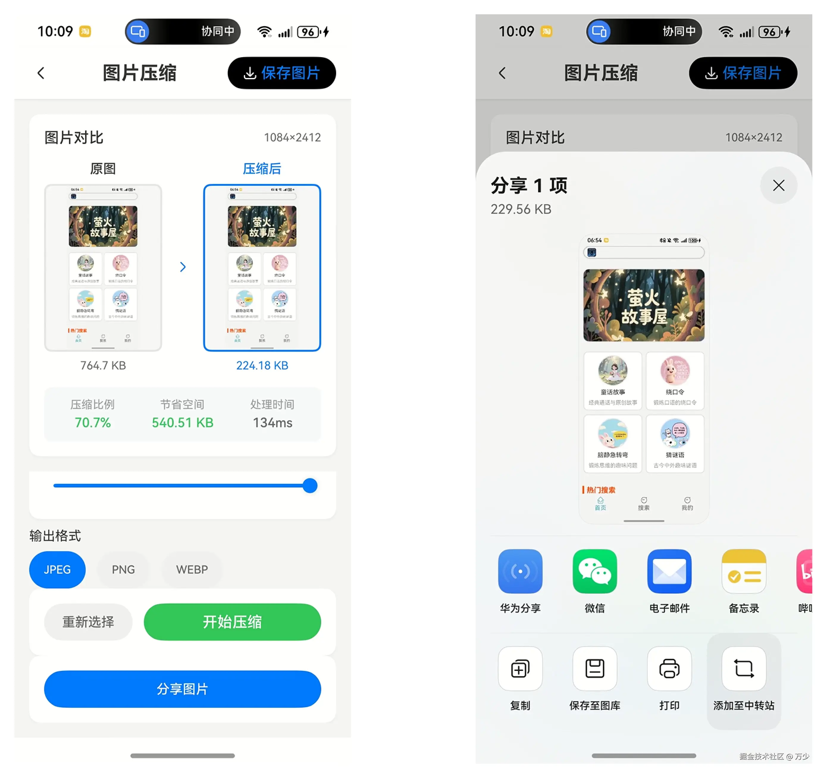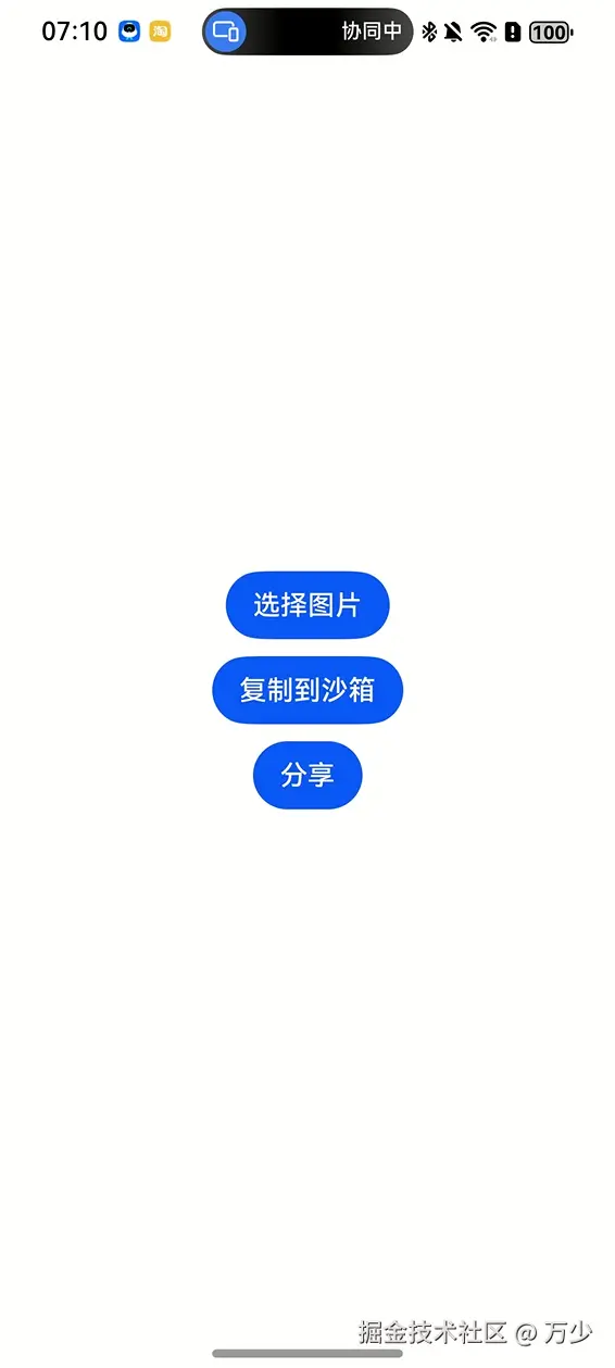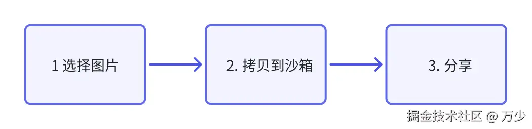 PhotoViewPicker调用系统图片选择器,支持多选并限制文件类型 - 沙箱拷贝:将选中图片拷贝到应用缓存目录,确保分享时的文件访问权限