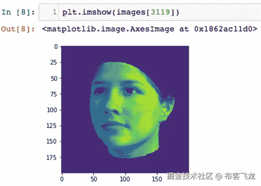 plt.imshow(images[])命令打印数据集中的一些随机图像,如下图所示,以便更好地了解图像中的面部轮廓。这也有助于了解图像的大小,后续步骤中需要用到: