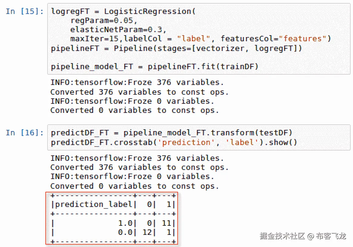 testDF通过应用拟合后的管道模型pipeline_model,转换成新的数据框predictDF,并创建一个名为“prediction”的新列。我们可以将标签列与预测列进行比较,如下截图所示: