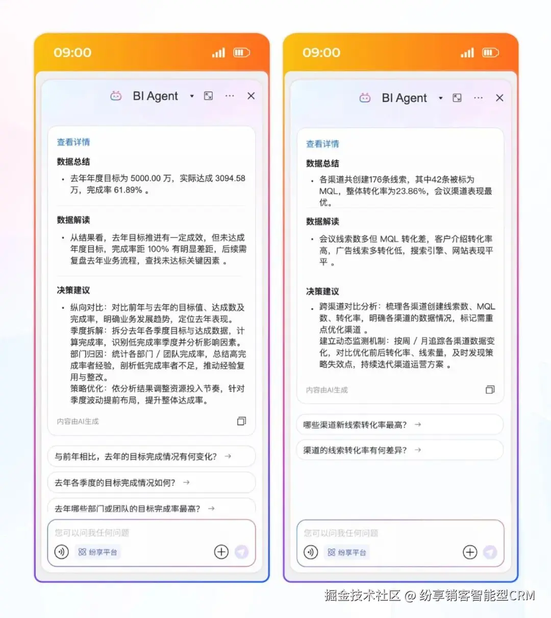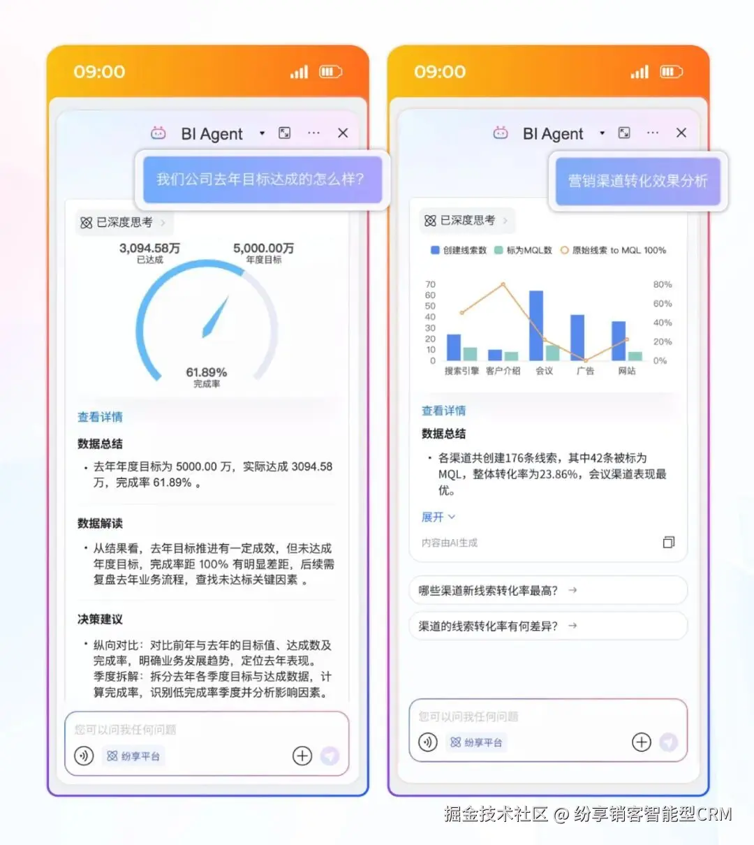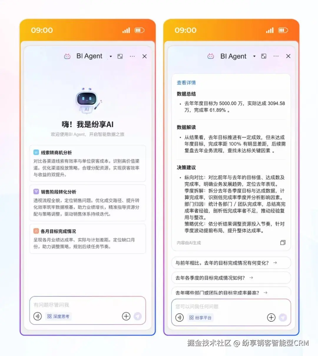 纷享销客 BI Agent 以 “降低数据使用门槛,提升决策效率” 为核心,基于 AI 能力应用,构建了覆盖数据交互、解读、归因、建议的全链路智能分析能力,旨在为企业构建从数据获取到决策落地的科学分析体系,让数据成为业务增长的 “决策引擎”。