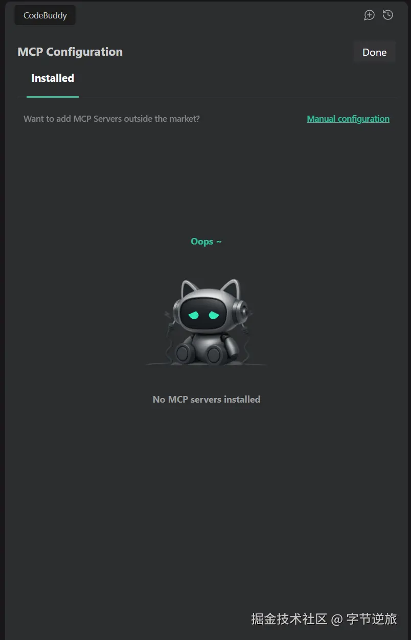 初次尝试在CodeBuddy上添加MCP服务时,我着实有点摸不着头脑。印象中,这类功能应该会有一个类似“MCP服务市场”的入口,让用户可以方便地选择和添加服务。然而,在这个IDE里,我并没有找到类似的功能。