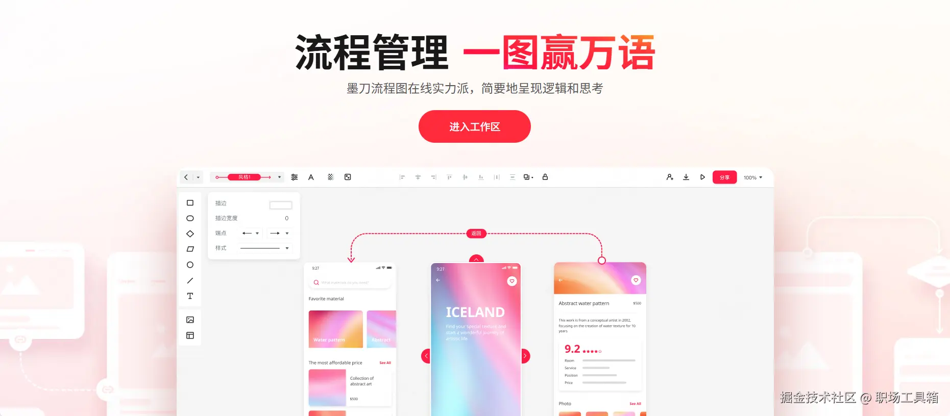 墨刀流程图是在线原型设计平台“墨刀”新近推出的在线流程图工具,专为产研团队打造。墨刀在原型设计领域积累了丰富经验,将这些优势延伸到流程图制作中,为用户提供了专业而易用的绘图体验。