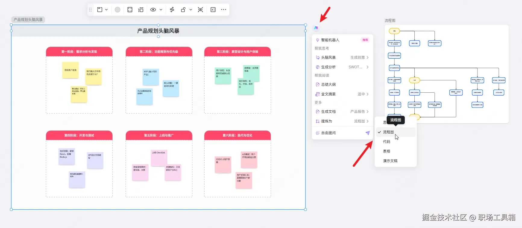 这个功能特别适合头脑风暴后的内容整理,团队在讨论过程中往往会在白板上记录大量想法和要点,通过内容提炼功能,这些零散的信息可以快速转化为结构化的流程图,让思路变得更加清晰。