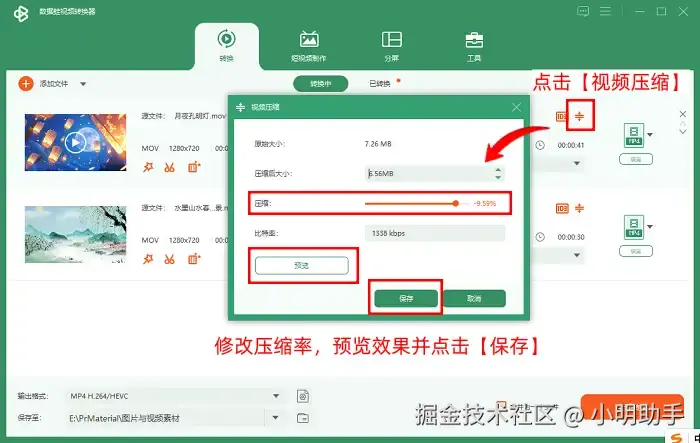 第2步: 点击【视频压缩】按钮,然后我们可以调节压缩率大小,从而更改输出视频文件的体积,我们可以通过点击【预览】按钮观看当前的压缩效果,调节到合适的压缩比之后点击【保存】按钮。