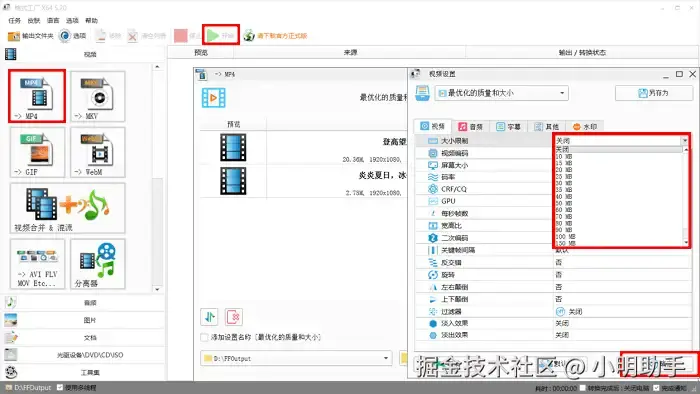 步骤: 点击进入格式工厂软件,然后点击【视频】选项卡,点击【→MP4】的功能入口,点击【添加文件】选项,可以在电脑中选择视频文件进行导入,之后点击导入窗格的【输出设置】,并且找到【视频-大小限制】选项,开启大小限制功能,可以将输出文件的体积限制在10MB-300MB,之后点击【确定】,回到任务栏中单击【开始】按钮。