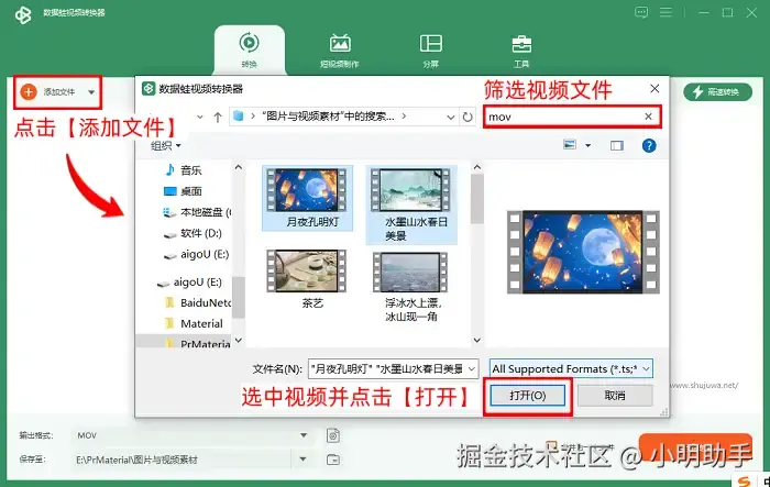 第1步: 打开软件内部界面之后,在首页的右上方位置,点击【添加文件】按钮,之后在导入文件的对话框中,我们可以在搜索框中输入目标视频文件的格式,然后选中多个视频并且点击【打开】。